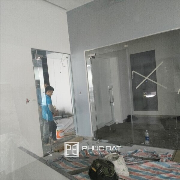 Các hình ảnh phía dưới Phúc Đạt chỉ chụp quá trình thi công do đó có hơi lộn xộn. Dù vậy, Quý khách hàng vẫn có thể thấy mỗi một tấm kính, cánh cửa lắp vào đang tạo nên sự hiện đại, nét chuyên nghiệp cho không gian làm việc sắp thành hình.