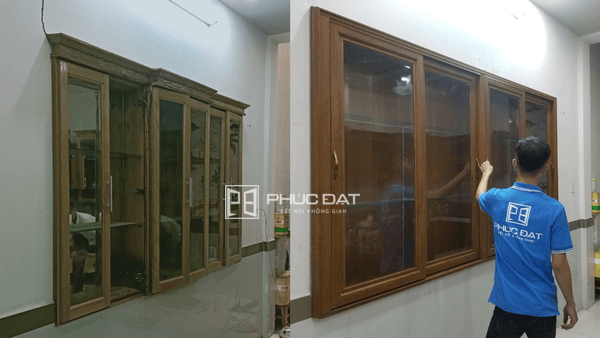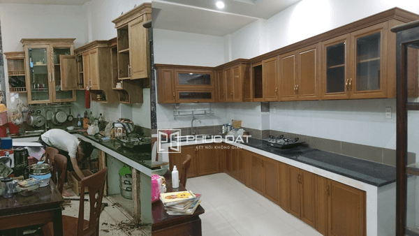 Trong các hình ảnh phía dưới, Nhôm Kính Phúc Đạt sẽ đặt chung hình ảnh tủ bếp gỗ bị hư hại (bên trái) bên cạnh tủ lắp đặt mới (bên phải) để Quý khách hàng so sánh.