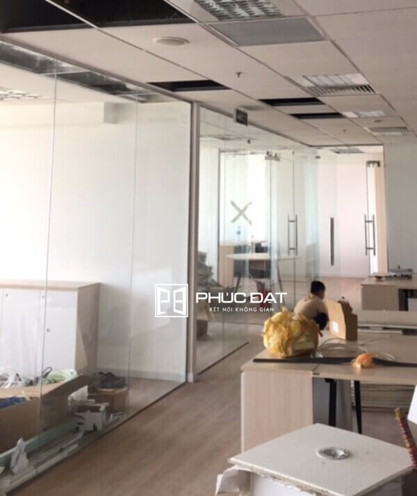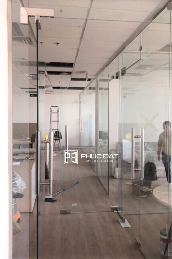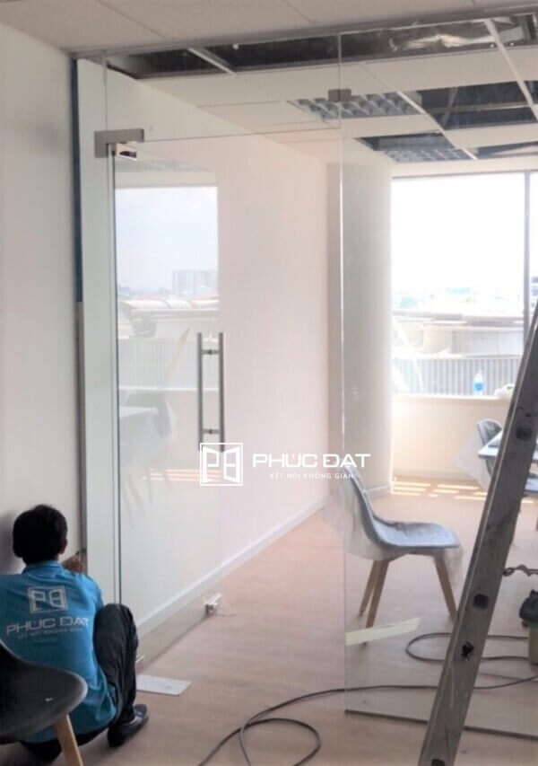 Công trình Nhôm Kính Phúc Đạt thi công hệ thống vách kính cường văn phòng tại đường Nguyễn Văn Trỗi, Quận Phú Nhuận, TPHCM. Tại công trình bao gồm hai sản phẩm vách kính cường lực ngăn phòng & cửa kính bản lề sàn.